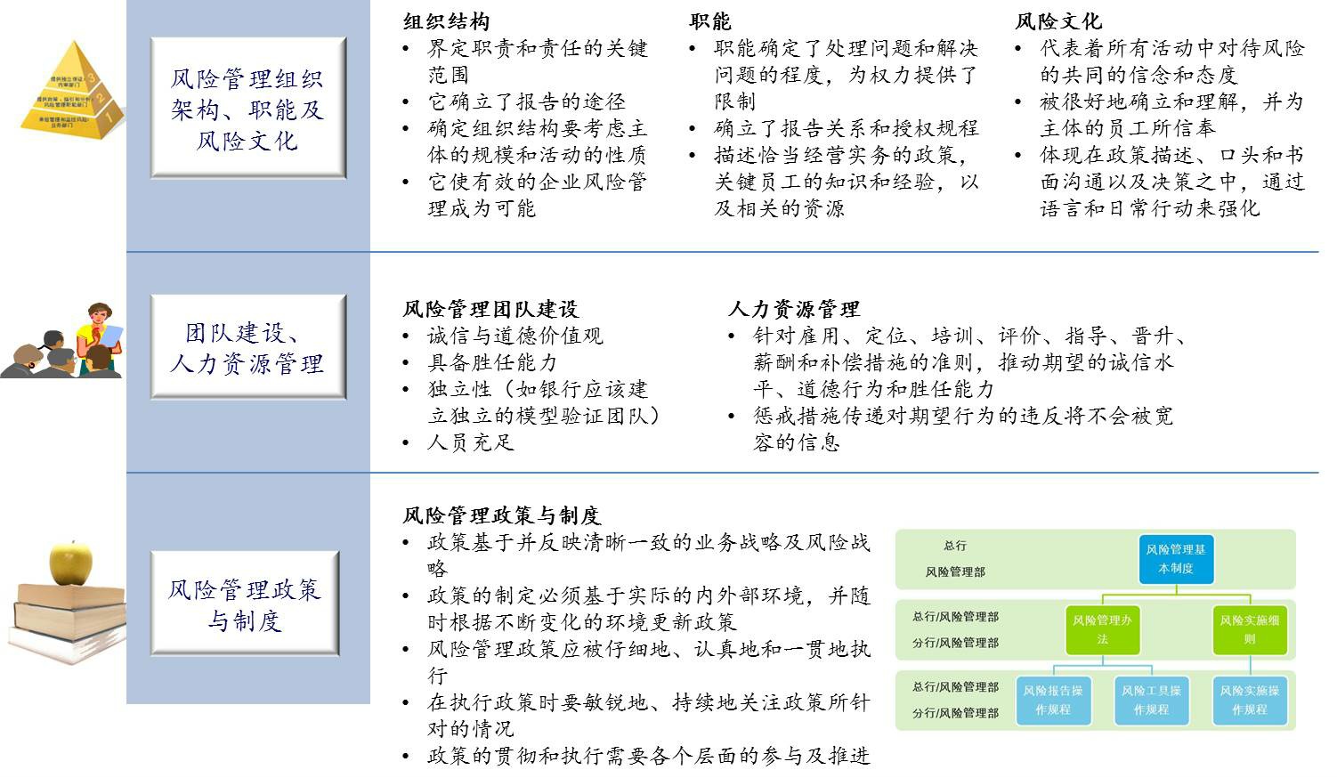 工作目标:健全风险管理组织架构和职能分工,建立科学的激励约束机制,建立健全风险管理政策,推动管理层和全体员工的风险管理理念的转变。
